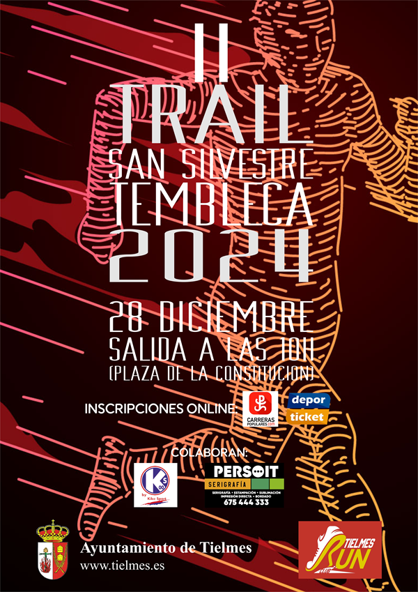 El Ayuntamiento de Tielmes organiza, con el patrocinio y con la colaboración de varias empresas, el II Trail San Silvestre Tembleca 2024, carrera a pie que se celebrará el sábado, 28 de DICIEMBRE de 2024, en la que podrán participar todas las personas que lo deseen sin límite de edad..